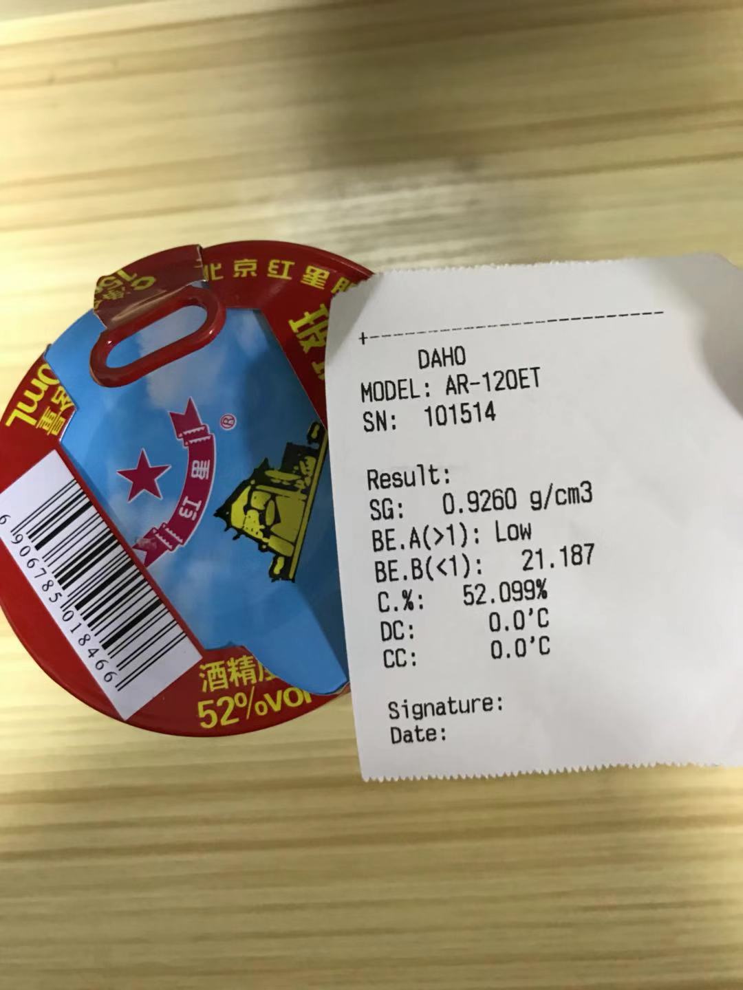 四川的王先生開的一家釀酒廠,需要測試白酒的含量,但以往并未用過我們這種臺式數顯式的濃度計,擔心測試不準確。為讓客戶放心,我公司特地買了一瓶白酒(酒精含量52%),并錄制了測試視頻,測試結果與白酒本身的含量完全一致,再次證明宏拓儀器設備經得起考驗。儀器操作簡單,新手也能輕易操作,需要了解如何操作的,可點此鏈接進行觀看,高精度酒精濃度計的操作視頻:http://m.ningxiagouqi.net.cn/video_show.asp?id=184