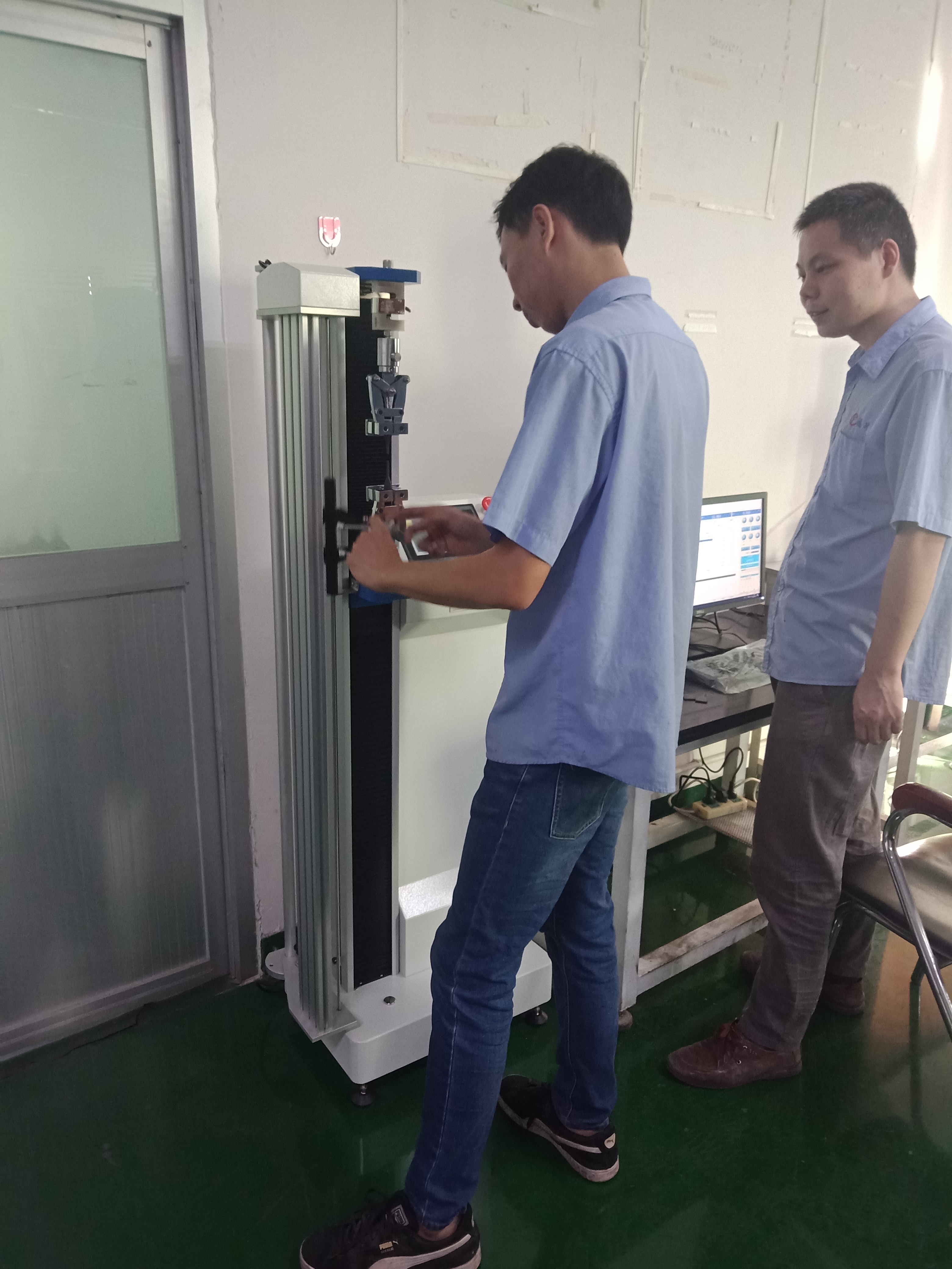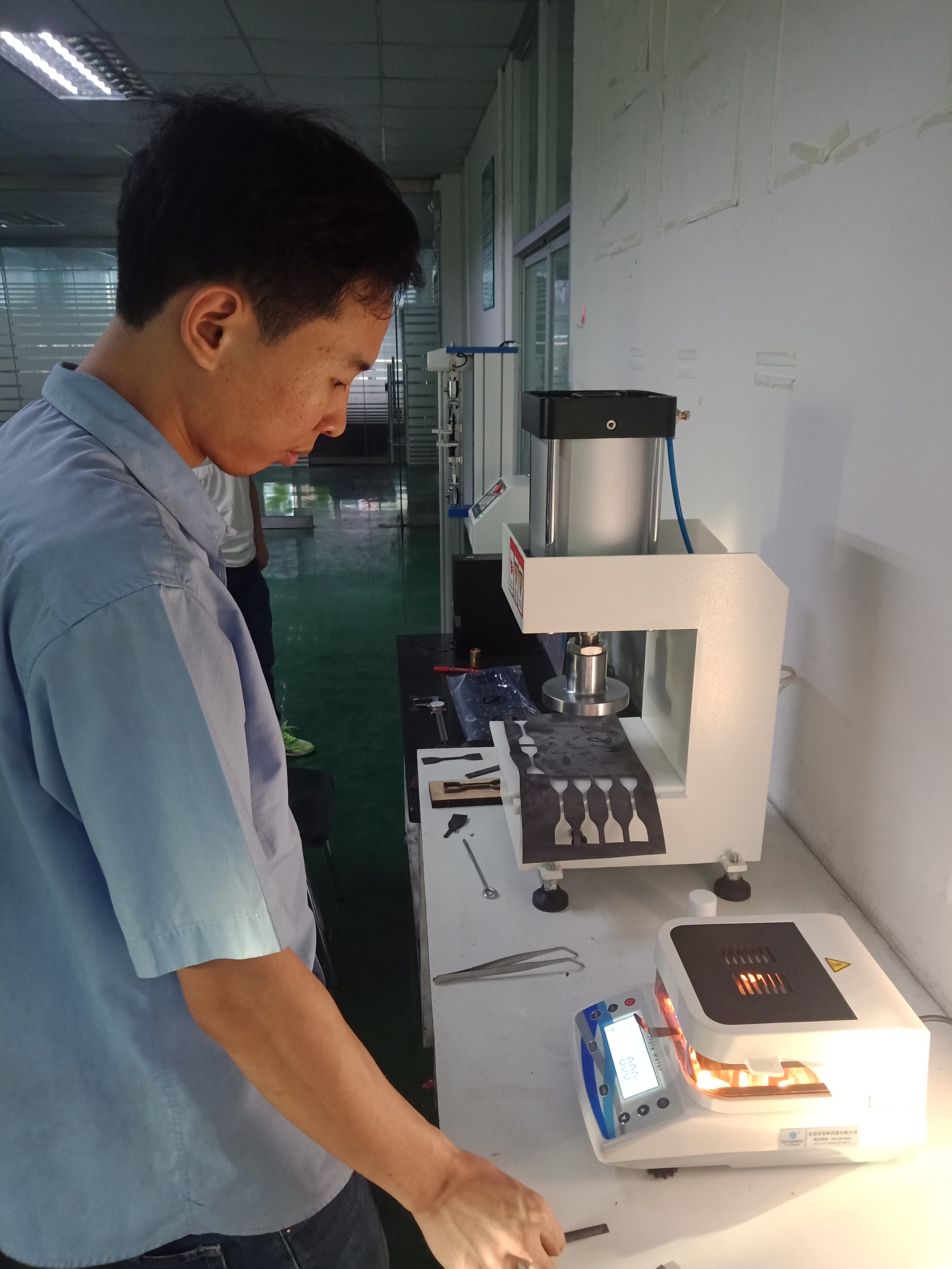 10月底,福磁電子的嚴經理等人帶樣品上門測試,分別測試了橡膠的拉伸強度和密度等數據,客戶表示對我們儀器和測試數據很滿意,當天還了解了切片機與水分儀,經過雙方的溝通,最終確認采購這四款儀器;簽訂合同兩天后安排送貨。